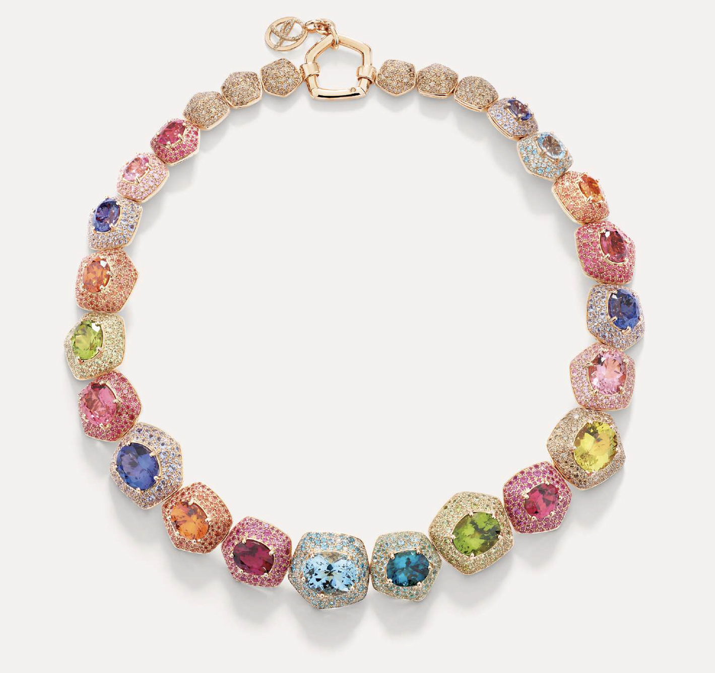 Bu kolye, mücevher ustasının benzersiz yaratıcılığını ve ustalığını gözler önüne seriyor. 'Taş içinde taş' temasını oynayan bu tasarım, oval kesim tanzanit, turuncu garnet, akuamarin, kırmızı ve pembe spinel, peridot, sarı turmalin, indigolit, rubelit ve morganit gibi canlı taşlardan oluşan bir paleti eşsiz bir kompozisyonda bir araya getiriyor. Her biri kendi pavé çerçevesine yerleştirilen bu taşlar; merkez taşları çevreleyen yakut, safir, garnet, spinel, tanzanit, zirkon, rubellit ve Paraiba turmalinleri ile ton-üzerinde-ton haleleri yaratarak her bir taşın ışıl ışıl güzelliğini arttırıyor.