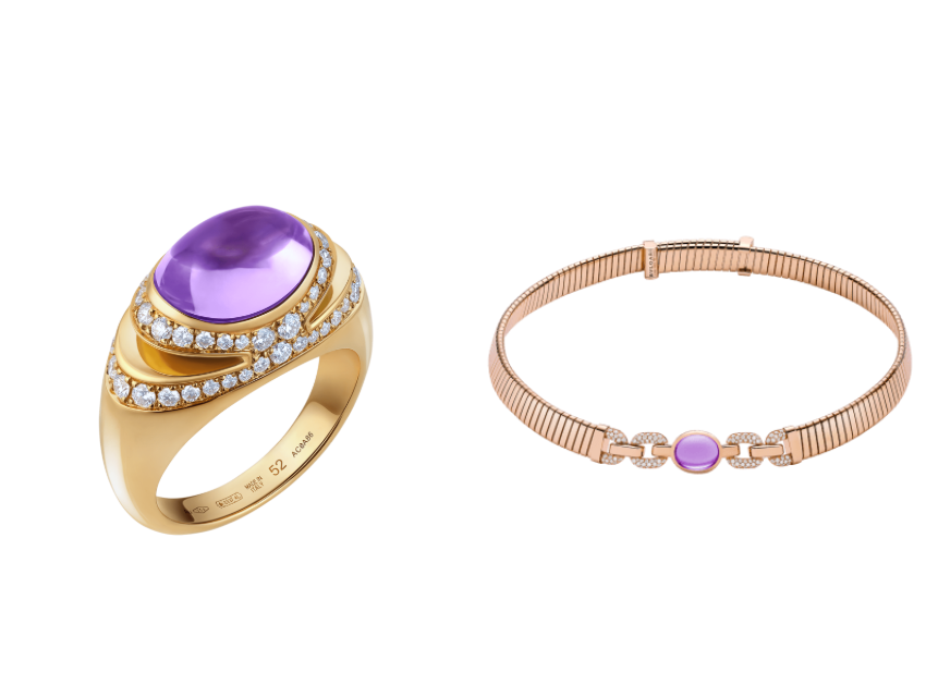 Pomellato için ametist, markanın renkli taşlarla kurduğu samimi ve gündelik lüks anlayışının doğal bir parçası. Üstelik bu yalnızca mücevherle sınırlı değil. Ametist artık saat dünyasında, hatta "haute horology"de bile kendine yer buluyor.