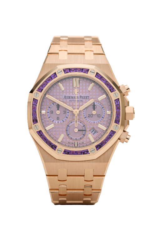 Audemars Piguet, Royal Oak gibi zaten ikonlaşmış bir tasarımda ametist kullanarak koleksiyonluk ve cesur bir yorum eklemiş