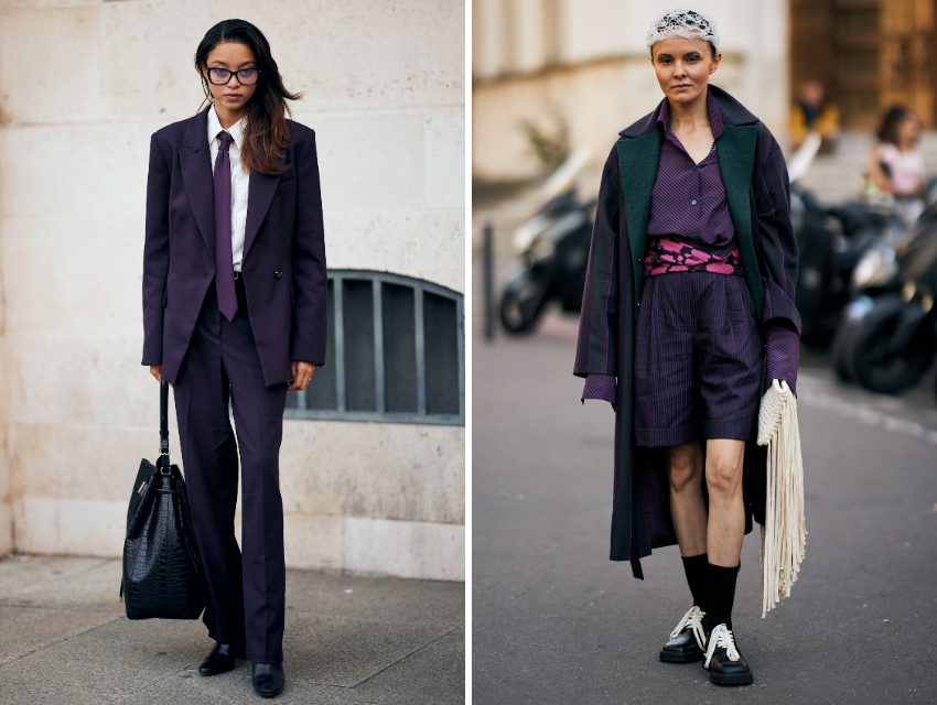 3. Mor Üst + Etek DengesiMorun güçlü karakterini daha yumuşak bir siluetle dengelemek için onu bir etekle kombinleyin. Bu eşleşme, feminen bir zarafetle birlikte net bir duruş sunar. Güç ve incelik bir arada.