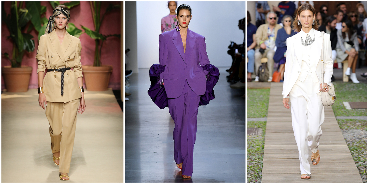 Luisa Spagnoli’nin İlkbahar Yaz 2020 defilesinde gördüğümüz bol kesim bej takım elbiseler örgü kemerler, sandaletler ve ipek saç aksesuarları ile eşleştirilerek bohem ama şık bir tarz yansıtırken, Prabal Gurung’da gördüğümüz renkli takım elbiseler göz alıcı stiller yaratmak için ideal. Buna ek olarak Etro’da metalik takılar ve omuz çantası ile eşleştirilen bembeyaz bir takım elbise ferah bir günlük stili için ilham kaynağı olabilir.