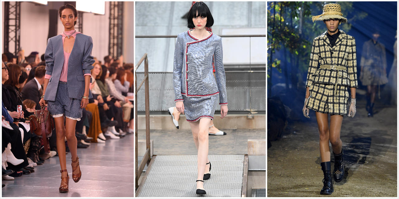 Mevsim gereği klasik pantolon formundan uzaklaşan stilleri de Chloe, Chanel ve Dior’un İlkbahar Yaz 2020 Defilelerinde görüyoruz. Çizgili takım elbiseler oldukça modern ve rahat bir yorum katan Chloe’nin yanı sıra Chanel ise ikonik etekli takımlarını parlak kumaşlar ile yorumluyor. Şortlu takım elbiselerine tam bir yaz esintisi katan Dior ise hasır şapka ve halat kemer eşleştirmesi ile takım elbiselerin her durumda giyilebileceğini kanıtlıyor!
