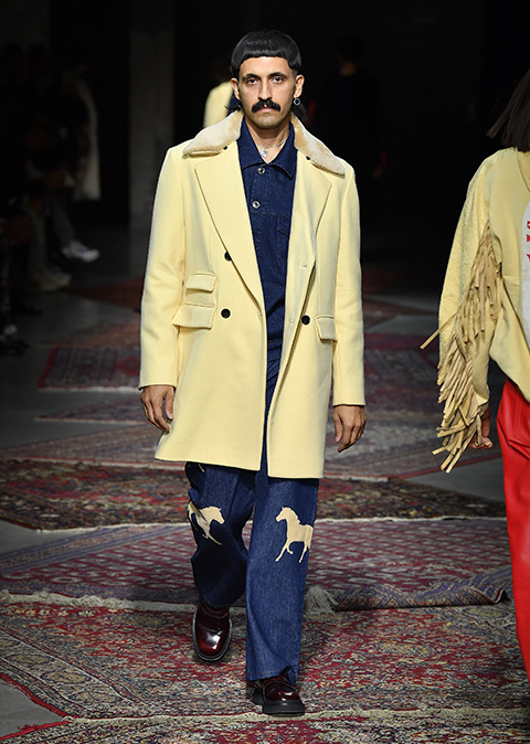 Gri yün takım elbise ve hardal rengi dış giyim parçalarında yer alan kakma örgü ve baskılarda Nemrut Dağı ve Kaçkar Dağları’ndan ilham alınırken, koleksiyondaki her bir parça 70’lerin vinil plak kapaklarının psikedelik grafiklerini hatırlatıyor. Rock ruhu, yumuşak deri trençkotlar, bootcut paça ve saçaklı kol kesimleri, kristal işlemeler ve peluş kürk gibi arketipik detaylar ve silüetlerde öne çıkıyor.
