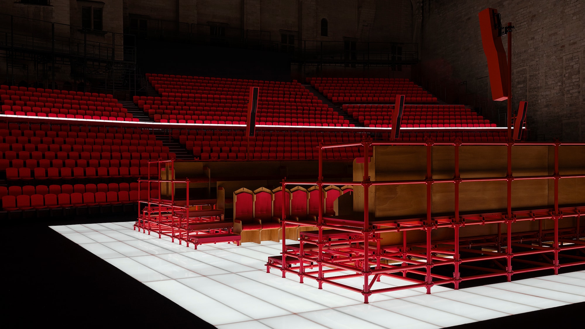 Louis Vuitton Cruise 2026 defilesinde Nicolas Ghesquière, Avignon’daki Palais des Papes’in Cour d’Honneur’ünü açık hava tiyatrosuna dönüştürdü. Ortaçağ'dan ilham alan bir atmosferde ahşap ve kırmızı kadife koltuklarda oturan izleyiciler, modellerin podyumla seyirci arasındaki sınırı kaldırarak mekanın içine karışmasına tanıklık etti. Es Devlin tarafından tasarlanan bu kurgu, defileyi izleyenlerde zamanda geriye gitme hissi yarattı.