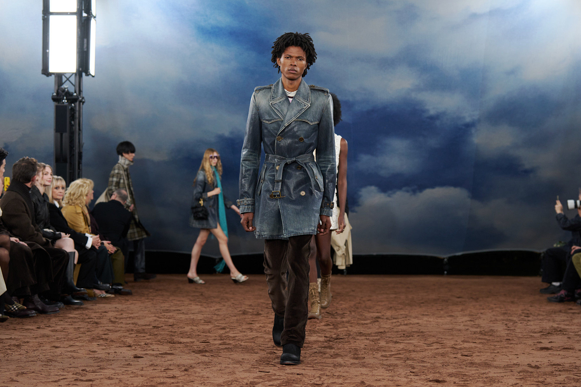 Farklı bir şehirde dikkat çeken mekan kurgularından biri ise Burberry’nin İlkbahar/Yaz 2026 defilesiydi. Toprakla kaplı zemin, kübik oturma düzeni ve içi bulutlu bir gökyüzü baskısıyla kaplanmış merkezi çadır, İngiliz usulü müzik festivallerini andıran bir atmosfer yarattı. Mekan Burberry’nin kültürel hafızasına doğrudan bağlanan kolektif bir deneyim alanı sundu. Set tasarımı burada da Bureau Betak tarafından üstlenildi.