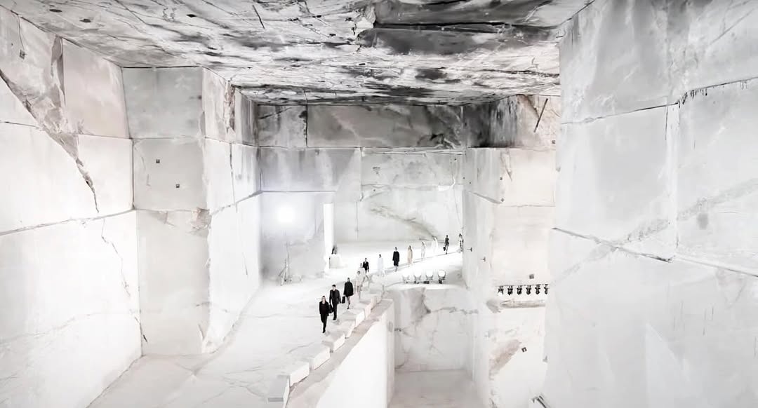 Bu güçlü örneklerin yanında Cos İlkbahar/Yaz 2025 defilesi, set tasarımının daha sessiz ama bir o kadar etkili bir anlatı kurabileceğini gösterdi. Atina’daki Dionyssos mermer ocağında gerçekleşen defile, yapay bir sahne kurmaktansa doğal bir mekanın kendisini anlatının merkezine aldı. Taşın ağırlığı ve alanın açıklığının yarattığı ferahlık, koleksiyonun temel ikiliğini yansıtıyordu: yapı ve akışkanlık, güç ve yumuşaklık. Bu yaklaşım, defile tasarımının yalnızca dramatik olmak zorunda olmadığını, aksine mekanla kurulan ölçülü bir ilişkinin koleksiyonun ruhunu derinleştirebileceğini hatırlattı.