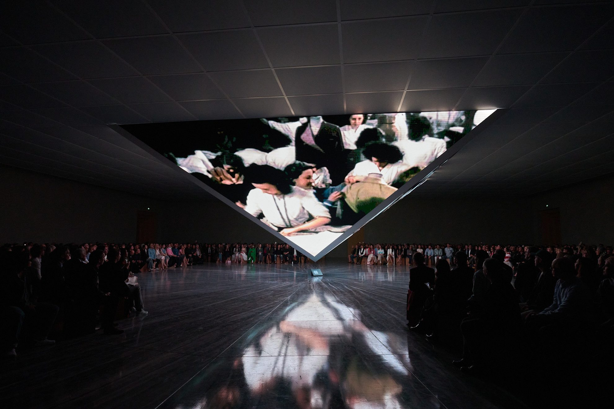 Jonathan Anderson’ın Dior için hazırladığı ilk kadın koleksiyonu, Luca Guadagnino işbirliğiyle, müze ile tiyatro arasında kurgulanan bir mekanda sunuldu. Krem tonlarındaki duvarlar, yumuşak ışık kullanımı ve ortadaki devasa ters piramit 1950’lerin rasyonel minimalizmine gönderme yapıyordu. Gösterişten uzak Bureau Betak tasarımı bu set, koleksiyonu dikkat dağıtmadan çevreleyen mimari bir çerçeve işlevi gördü.