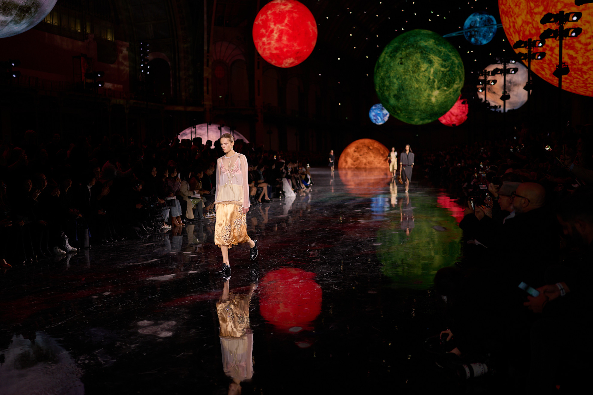 Matthieu Blazy’nin Chanel’deki ilk kreatif direktörlük anı da bu anlardan biri oldu. Chanel’in favori defile mekanlarından biri olan Grand Palais’nin içinde kurulan kozmik sahne, güneş sisteminden ilham alan devasa ışıklı kürelerle şekillendi. Bureau Betak tarafından tasarlanan on beş metre genişliğindeki bir “güneş” ve parlak ay yüzeyini andıran podyum, Chanel’in mirasını zamansız ve evrensel bir bağlama yerleştirdi.