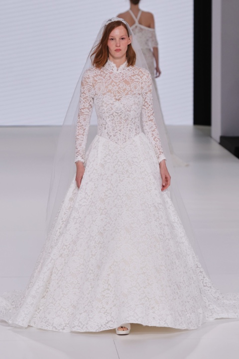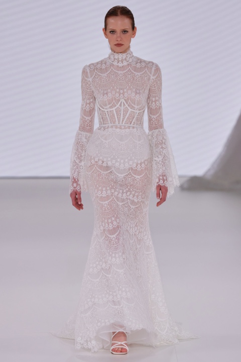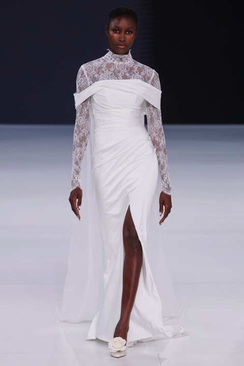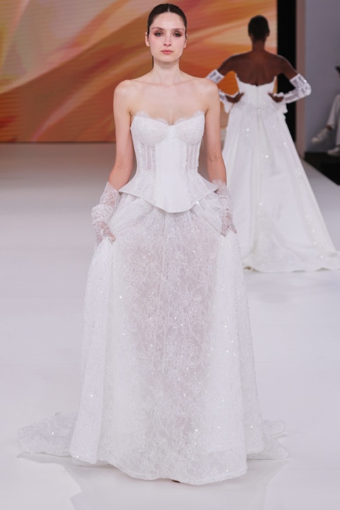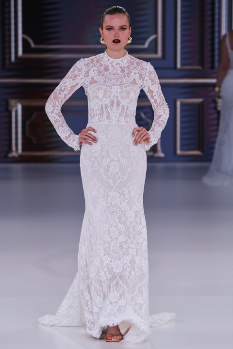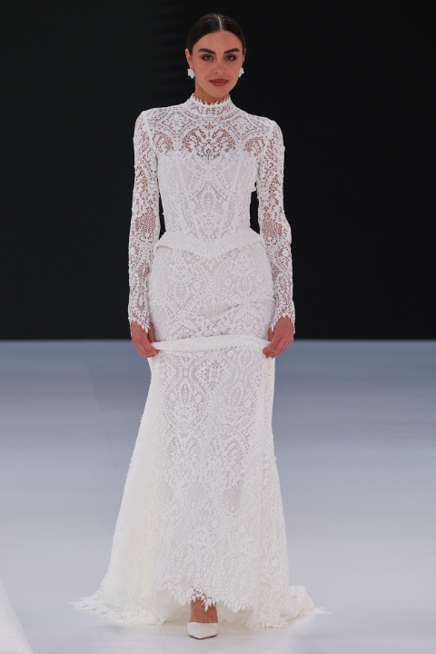 Bazı tasarımlar baştan aşağı dantelle kaplanarak klasik gelinlik hayalini modern bir yoğunlukla yeniden kuruyor; bazıları ise danteli yalnızca bir dokunuş olarak kullanıp siluete hafif bir romantizm katıyor. Bu sezonda “fazla” ya da “eksik” yok, her şey oran, his ve denge üzerine kurulu.