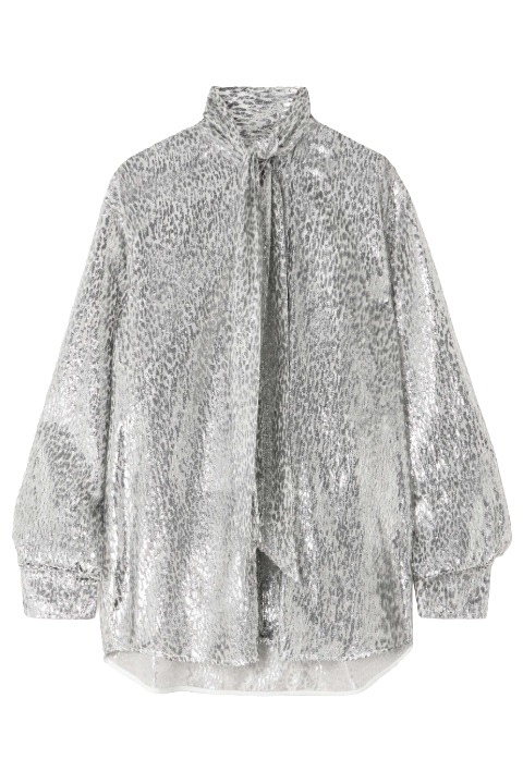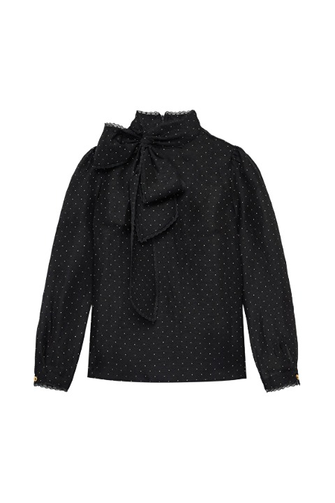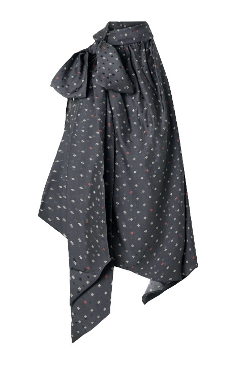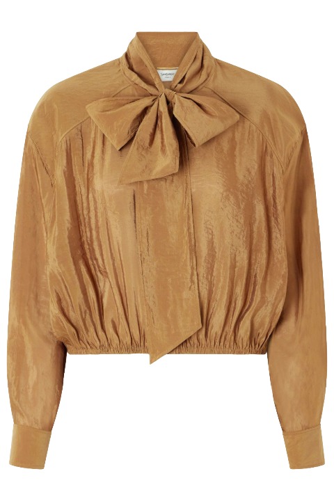 Saint Laurent cephesinde ise fularlı bluzlar daha iddialı bir siluetle ele alındı. Koleksiyonun dikkat çekici bir bölümü, dramatik ölçekte büyük fiyonklarla tasarlanan bluzlara ayrılmıştı. Peki neden şimdi? Geçtiğimiz sezon zirveye ulaşan fiyonk estetiği daha çok gençlik ve masumiyet kodlarıyla ilişkilendirilirken, fularlı bluzların bugünkü yorumu daha “çalışan kadın” odaklı. Fularlı bluz, bu sessiz dramayı stilin merkezine taşıyor.