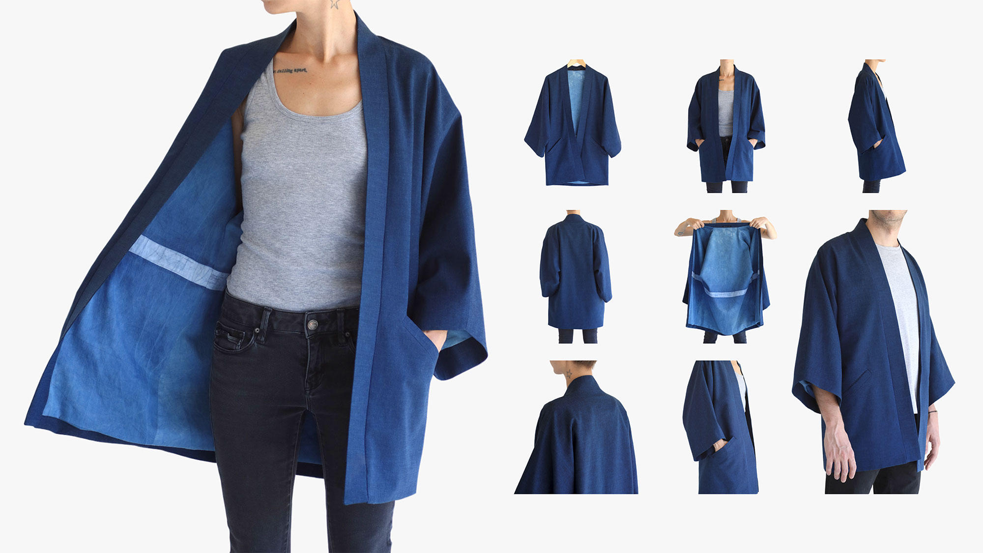 Jacket, oldukça sade görünüyor ama her biri aslında 5 günlük yoğun bir çalışma sürecinden sonra ortaya çıkıyor. Elde desenlendirilen denim dış kumaş ve indigo boyanmış saten astar Jacket’ın temelini oluşturuyor. Astarın bir kısmına mum batik tekniği ile çizgiler verilirken bir kısmına da geleneksel Japon bağlama tekniği olan Kanoko Shibori uygulanıyor. Böylece cekete yaklaşık 240 düğüm atılıyor. Boyama gününde ise mumla çizilen ve iple bağlanan satenler Indıgo dolu kovaya batırılıyor. Kovadan yeşil renkte çıkan ceket, oksijenle temas ettikçe maviye dönüyor. Ve tüm işlemler tamamlandığında denim ve satenin büyük buluşması gerçekleşiyor. Tüm kumaşlar kalıplara göre kesilip dikişleri tamamlandıktan sonra bu hale geliyor :