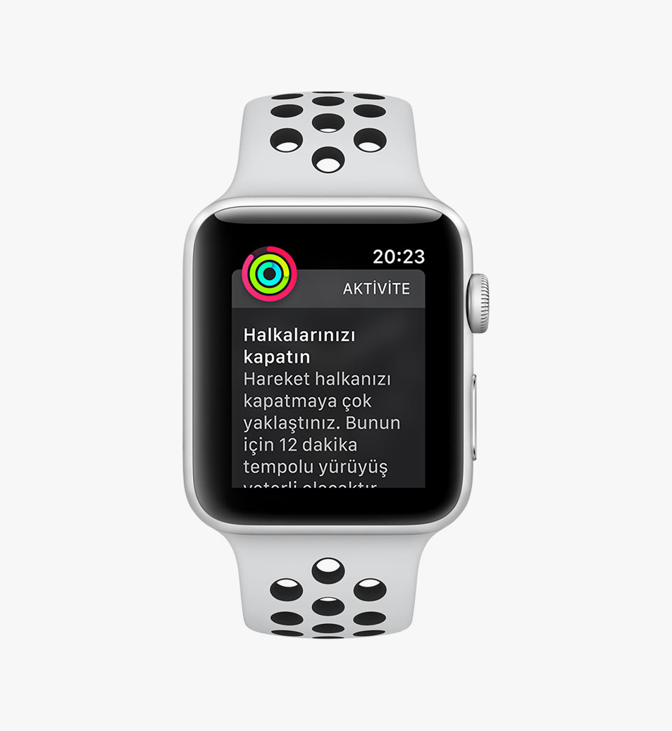 Apple Watch Series 3, ihtiyaç duyduğunuz motivasyonu sağlamak için size kişisel antrenörlük de yapıyor. Sabahları gelişiminizle ilgili kişisel güncellemeler, akşamları ise halkaları kapatmanız için öneriler sunuyor. Ayrıca, aktivite ve antrenman geçmişinizi baz alarak size her ay yeni bir hedef öneriyor.