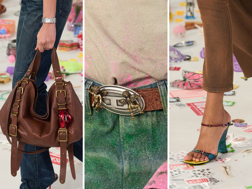 Minimal tabanın üzerine eklenen maksimal detaylar sezonu tanımlıyor. Suni kürk ve shearling dokular, dantel elbiseler, metalik kumaşlar ve yoğun süslemeler neredeyse her defilede görüldü. Broşlar sezonun öne çıkan aksesuarıydı. Vintage kristal modellerden deri çiçek formlara kadar geniş bir yorum alanı vardı. Diz üstü çizmeler ve keskin stiletto’lar 90’lar referansını güçlendirdi. Max Mara’da saf ve net minimalizm, Emporio Armani’de beyaz gömleğin farklı varyasyonları, Diesel’de yüksek enerjili kulüp estetiği… Milano, zanaatkarlık ile deneysel ruh arasında geniş bir spektrum sundu.