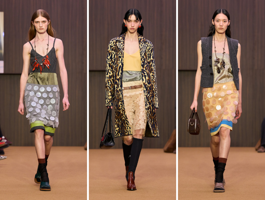 Bu sezon katmanlama yalnızca estetik değil, işlevsel bir tercih. Prada’da modeller aynı defile içinde birden fazla çıkış yaptı, her seferinde bir katman çıkararak yeni bir görünüm sundular. Bu yaklaşım, günümüz gardırobunun çok yönlülük beklentisine yanıt veriyor. Etek üzerine elbise, ince kumaş üzerine yapılandırılmış ceket, birden fazla dış giyim parçasının birlikte kullanımı… Katman, artık stil oyunundan çok mimari bir kurgu.