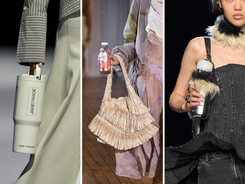 Bazı markalar bu yaklaşımı doğrudan şehir temposuna bağladı. Jane Wade defilesinde modeller, markalı su şişeleri ve enerji içecekleriyle yürüdü. Collina Strada’da bir model yarı içilmiş kombucha şişesiyle sanki bir New York bakkalından yeni çıkmış hissi yaratıyordu. Aknvas koleksiyonunda ise taşlı su şişeleri, seyahat temasını destekleyen suni kürk aksesuarlarla birlikte sunuldu.
