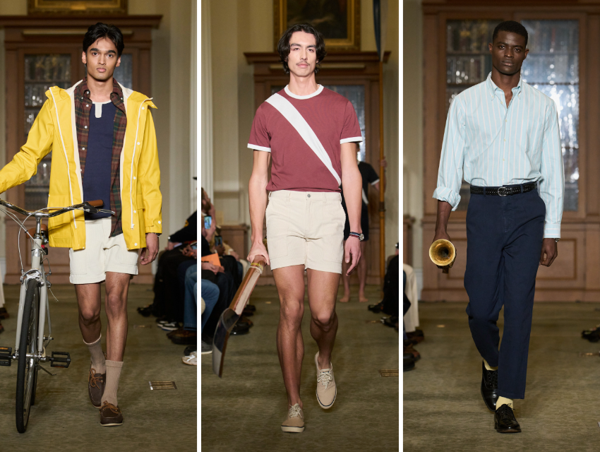 Daha gündelik bir okuma ise J. Press’ten geldi. Koleksiyonun çıkış noktası olan “Ivy preppy” ruhu şemsiyeler, kitaplar ve müzik enstrümanları gibi sıradan Ivy okulu öğrencisi nesnelerinde okunuyordu. Derslere yetişmeye çalışan bir öğrencinin ellerindeki eşyalar bu kez stilize edilmiş bir podyum anına dönüştü. Ancak kürek takımı sporcusu gibi gözüken birinin elinde kürekle çıkması, bizim kolaylıkla görebileceğimiz bir an değil.