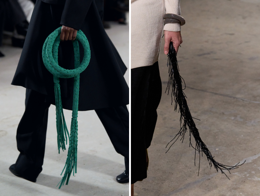Bazı objeler koleksiyonun anlatısını güçlendirmek için vardı. Diotima’nın “Femme Cheval” başlıklı koleksiyonunda modeller kırbaçlar taşıdı; referans noktası Wifredo Lam’ın aynı adlı eseriydi. Zankov da benzer bir aksesuar kullanımına gidip modelin görünümünü kırbaç ile tamamlamayı seçmişti.
