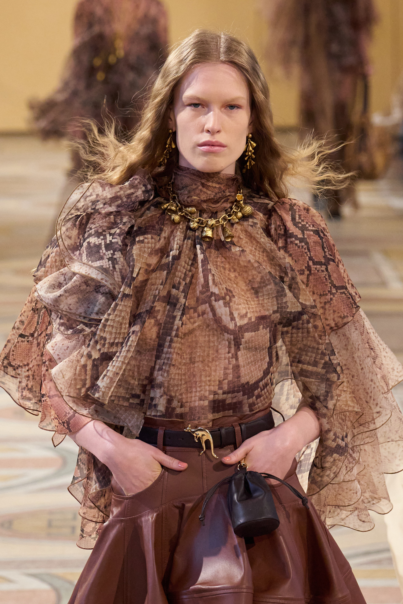 Romantik çizgilere kontrast bir hava katmayı seven markalardan biri de Zimmermann. Animal print konusunda bu sezon başarılı yorumlara imza atıyor. Yılan desenleri şifon bluzlara karizmatik ve vurucu bir hava verirken Zimmermann'ın "boho" çizgisi tasarımlara dengeli bir kontrast katıyor.