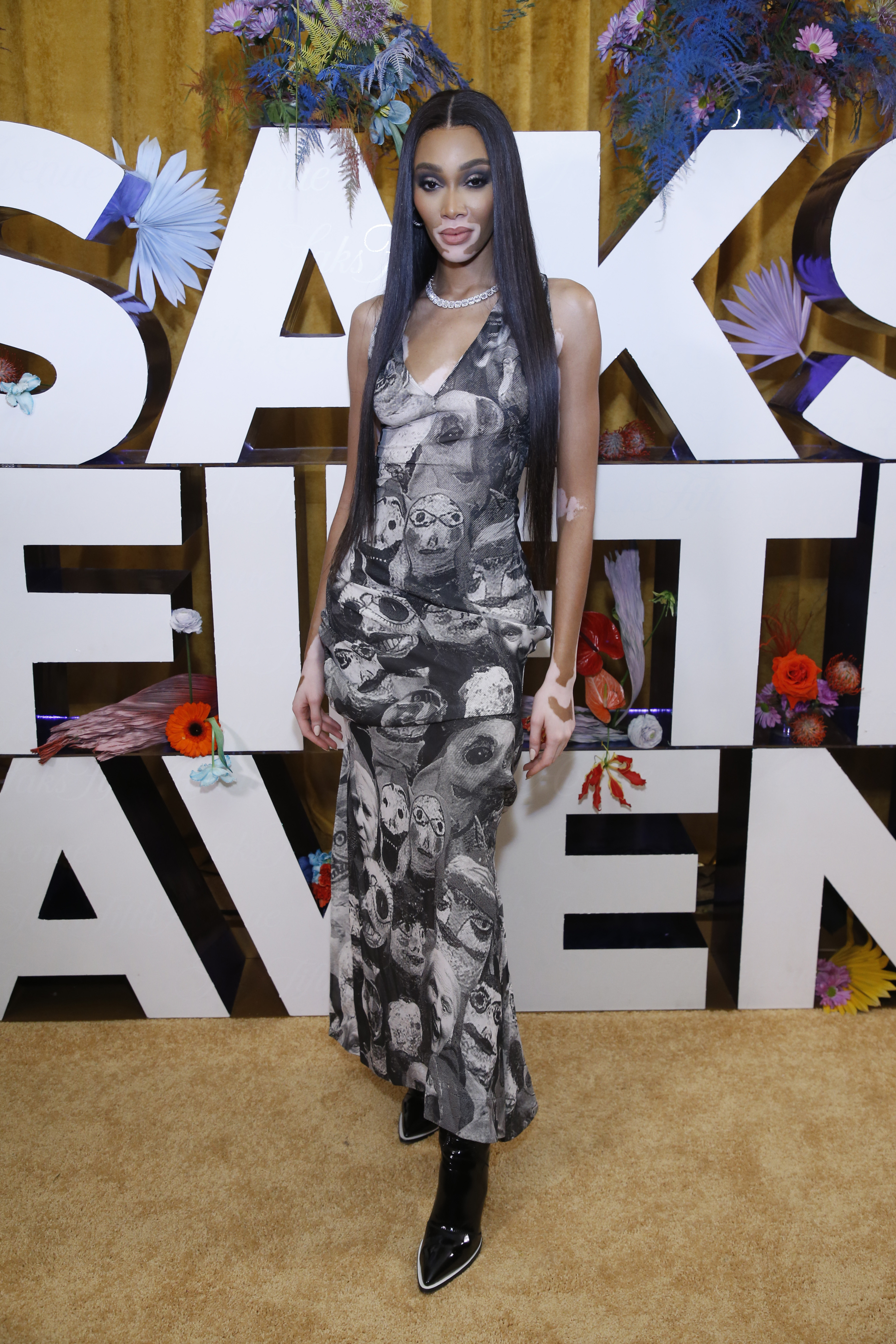 Winnie Harlow, New York’taki ‘L’Avenue at Saks’ kutlaması için Vivienne Westwood’un Sonbahar 2017 koleksiyonundan desenli bir elbise giydi.