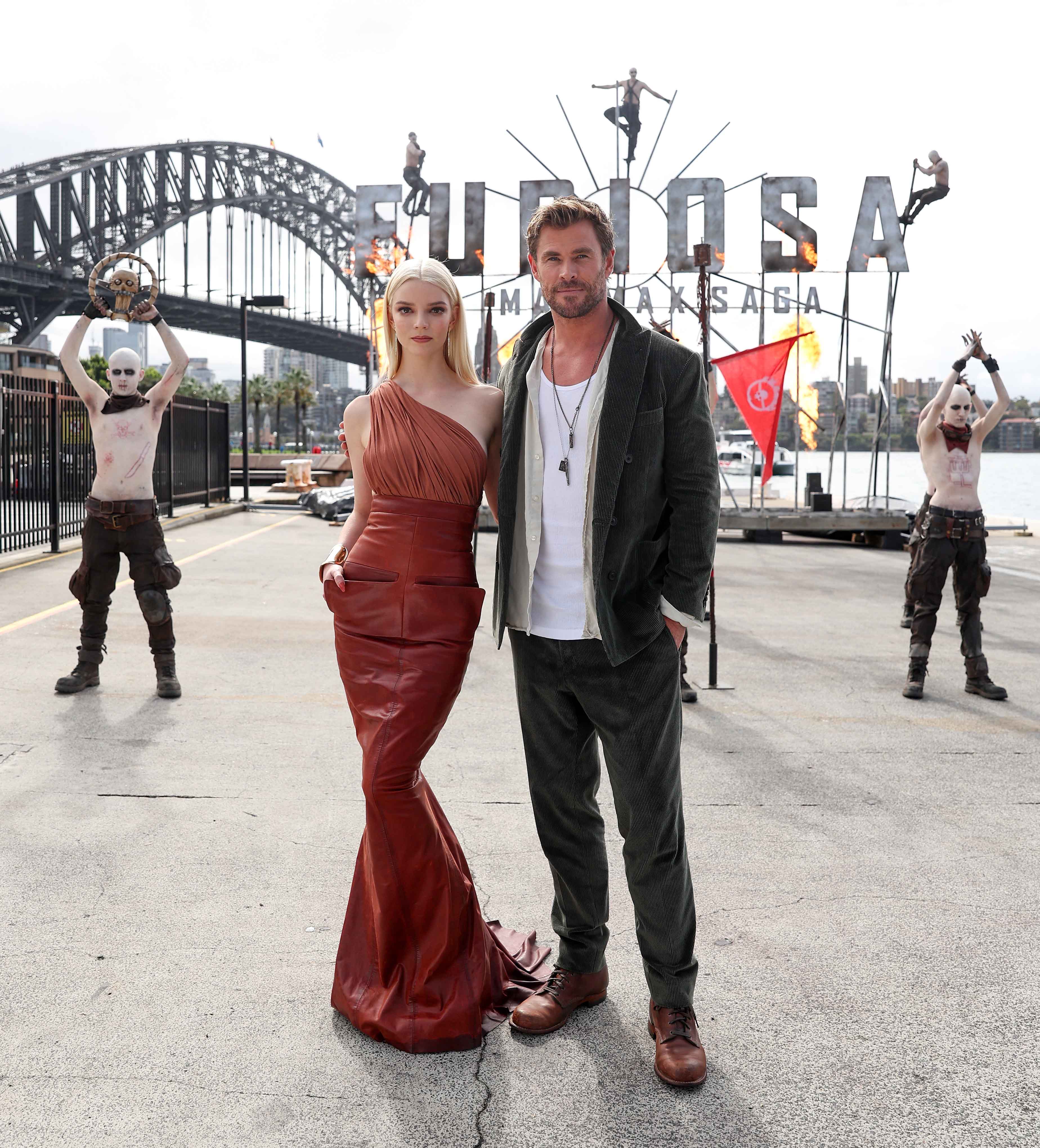 Rol arkadaşı Chris Hemsworth, Taylor-Joy'un gösterişli tarzının yanında gri bir takım elbise giydi.