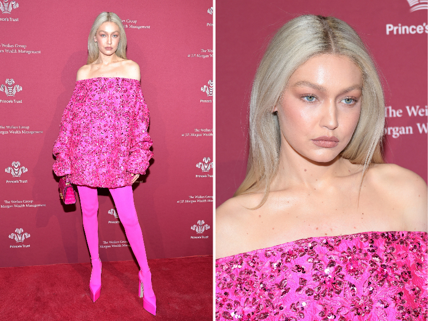 Gigi, Pierpaolo Piccioli'nin en son Valentino koleksiyonundan omuzları açık pembe bir mini elbise giydi. Görünümünü tam olarak podyumda göründüğü gibi şekillendirdi, uyumlu pembe çorap ve platform ayakkabılarla eşleştirdi. Bu, gökyüzüne uzanan yüksek platformların anın en iyi ayakkabısı olduğuna dair son onay olsun…