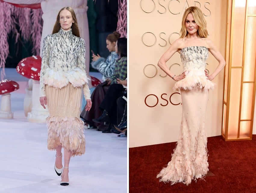 Bazı görünümler ise bire bir uyarlamalar yerine, podyumda başlayan fikirlerin geliştirilmiş versiyonlarıydı. Nicole Kidman ve Kate Hudson gibi isimler, tasarımcıların koleksiyonlarda denediği tekniklerin ve silüetlerin kırmızı halı için yeniden yorumlanmış hallerini taşıdı. Modaevlerinin bu yaklaşımı, couture’ün doğasına da işaret ediyor: Tasarımcılar, tıpkı yönetmenler gibi, aynı fikri farklı bağlamlarda yeniden anlatabiliyor.