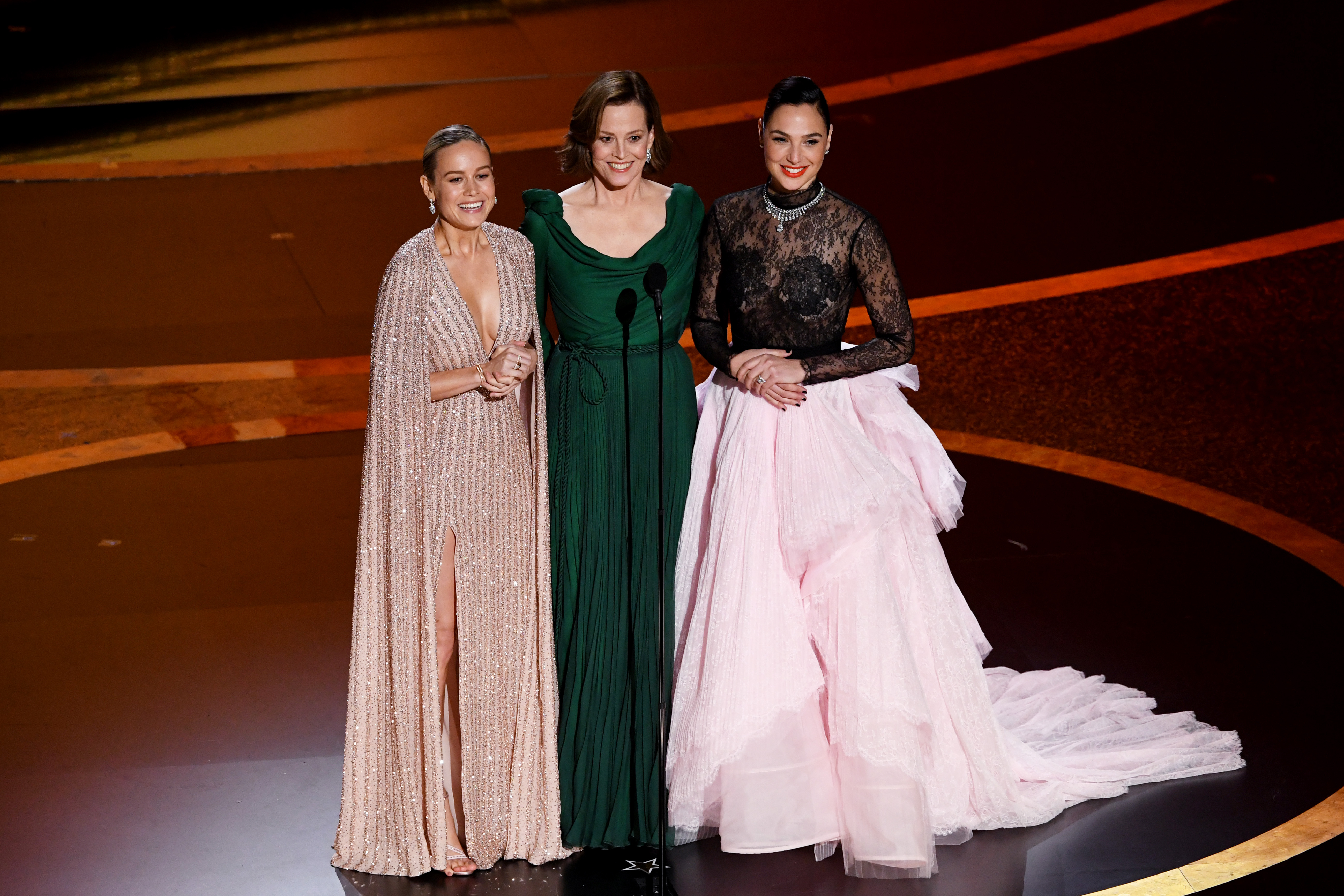 Akademi Ödülleri'nin ilk kadın orkestra şefi olan Eimear Noone’u tanıtmadan önce Brie Larson, Gal Gadot ve Sigourney Weaver esprili bir şekilde seyirciye mesaj verdiler. “Burada beraber durup tüm kadınların süper kahraman olduğunu söylemek istiyoruz” diyen Larson, Weaver ve Gadot, herkesin katılabileceği bir “Dövüş Kulübü” kuracaklarını belirttiler. Kaybedenlerin “Hollywood’da kadın olmak nasıl bir şey?” gibi sorulara cevap vermek zorunda kalacaklarını söyleyen üçlü, sadece kadınlara yöneltilen sorulara yönelik ince bir mesaj verdiler. “En İyi Orijinal Şarkı” ve "En İyi Film Müziği” Ödülleri'ni açıklamadan önce ekrandaki kadın süper kahramanları onore eden Weaver, “Üçümüz oldukça güçlü bir kombinasyon oluşturuyoruz” dedi.