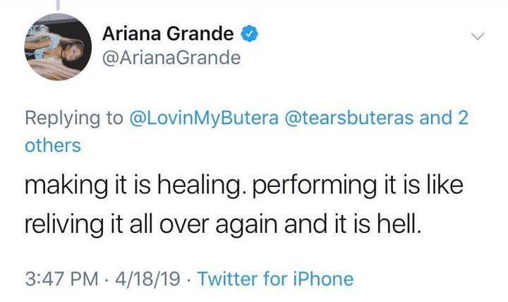 Bu haberler, şarkıcının tura çıkmanın akıl sağlığı için iyi olduğunu düşünmediğini açıklamasının ardından geldi. Şuanda silinmiş olan tweetlerde Ariana'nın bir fanı şarkıcıya, 'müzik senin terapin ve iyileştiğini görmek beni mutlu ediyor' şeklinde tweet attı. Grande, 'müzik yapmak iyileştirici. Ama tekrar tekrar performans sergilemek cehennem gibi' şeklinde cevap verdi.