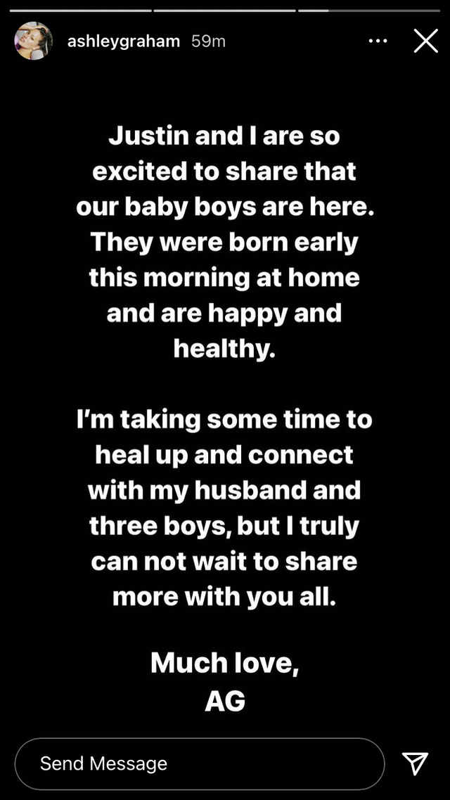 Ashley Graham ve eşi Justin Ervin’i tebrik etmemiz gerek! İkiz bebeklerine doğum yaptığı haberini Instagram hikayesinden doğrulayan Graham, “Oğullarımızın dünyaya geldiğini duyurduğumuz için ben ve Justin çok heyecanlıyız. Bu sabah evde doğdular, mutlular ve sağlıklılar” yazdı.