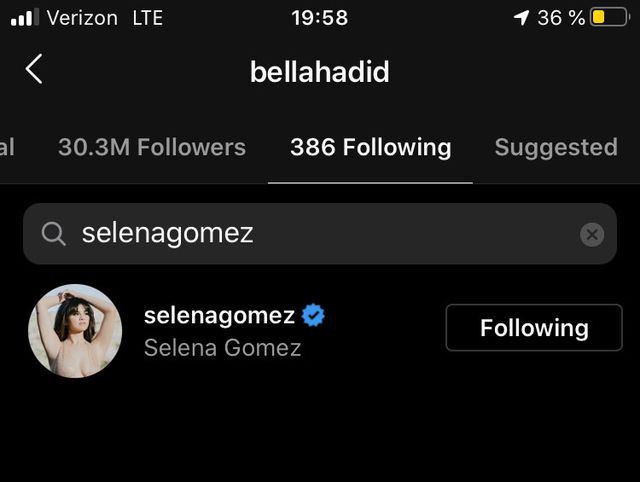 Gomez, 2017'de The Weeknd ile ilişkisini duyurduktan kısa bir süre sonra birbirlerini takipten çıkmıştı. The Weeknd ile ilişkisinin sonlanması ardından 2019'un Kasım ayında Gomez, Hadid'i tekrar takip etmeye başladı.
