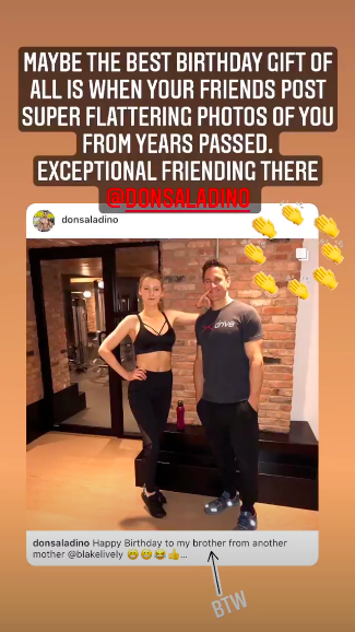Son olarak spor eğitmeni Don Saladino’nun paylaştığı kutlama mesajını kendi hikayesinde paylaşan Lively, “Belki de en güzel doğum günü hediyesi, arkadaşlarınızın geçmiş yıllardan müthiş fotoğraflarınızı koyması,” dedi.