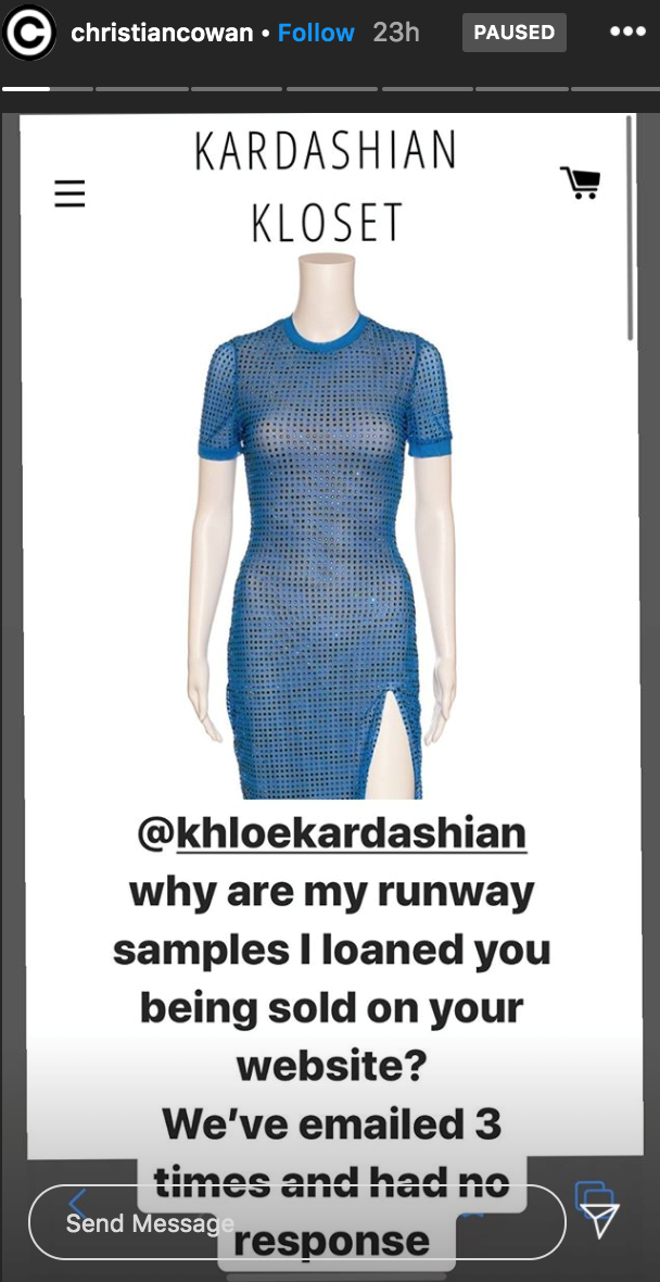 Instagram hikayesi üzerinden Khloe Kardashian’ı etiketleyerek bir paylaşım yapan Cowan, Kardashian’a ödünç verdiği elbisenin geri verilmediğini söyledi. Kardashian Kloset markasından bir ekran görüntüsü paylaşan Cowan, ödünç verdiği elbisenin Kardashian kız kardeşlerinin internet sitesinde satıldığını iddia etti. “Khloe Kardashian, neden sana ödünç verdiğim defile numuneleri internet sitende satılıyor? Sana üç defa email attık ve asla cevap alamadık,” diyen Cowan, Hollywood’da şok etkisi yaratan bir açıklama yaptı.