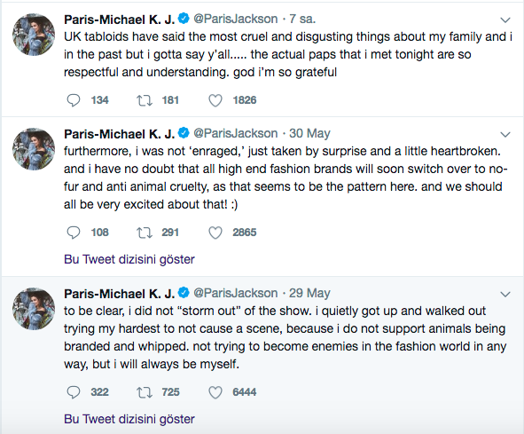 Dior'dan henüz resmi bir açıklama gelmese de, geçtiğimiz gün, Jackson, Twitter'dan bir açıklama yaparak olaya açıklık getirdi.  “Açık olmak gerekirse gösteriyi bir ‘fırtına’ gibi terk etmedim. Sessizce ayağa kalktım ve bir sahne yaratmamak için elimden geleni yaptım, çünkü hayvanların marka taşımasını ve atların kırbaçlanmasını desteklemiyorum."