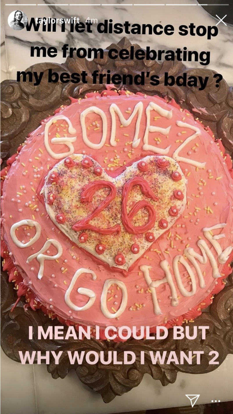 Mayıs ayından beri Reputation müzik turnesinde olan Swift, yakın arkadaşı ile sık sık görüşemiyor. Mesafelerin en yakın arkadaşının doğum gününü kutlamasına engel olmadığını belirten Swift, Selena Gomez için aldığı pastayı Instagram hikayesinden paylaştı.